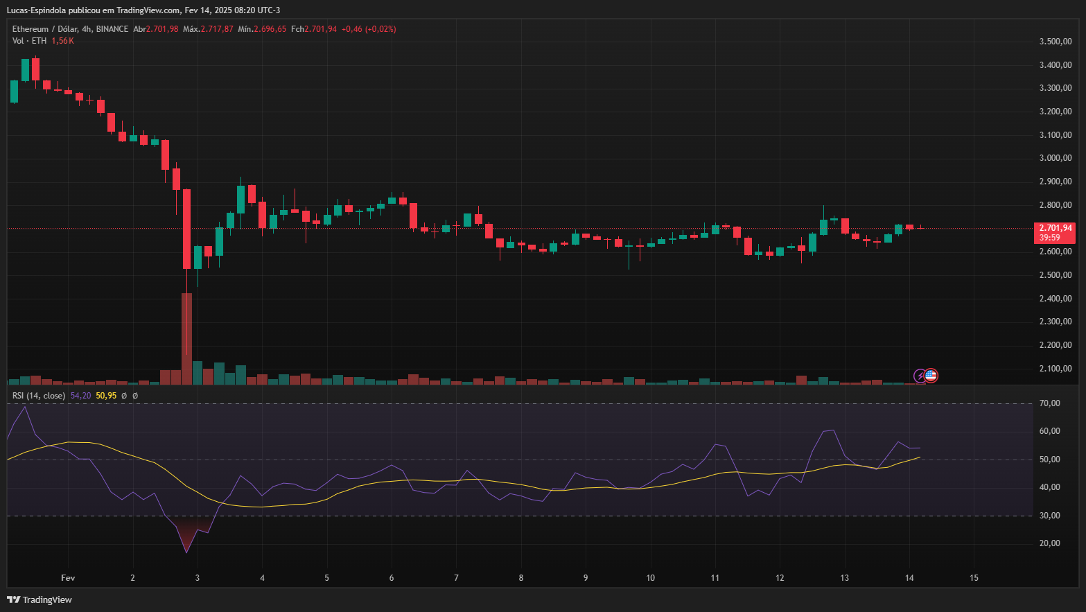 O Ethereum continua oscilando dentro de uma faixa estreita entre US$ 2.600 e US$ 2.750, sem força para um rompimento significativo. O Índice de Força Relativa (RSI) está em 54,17, demonstrando um mercado equilibrado, sem sinais claros de sobrecompra ou sobrevenda. Esse comportamento sugere que o ETH pode estar acumulando antes de um movimento mais expressivo.