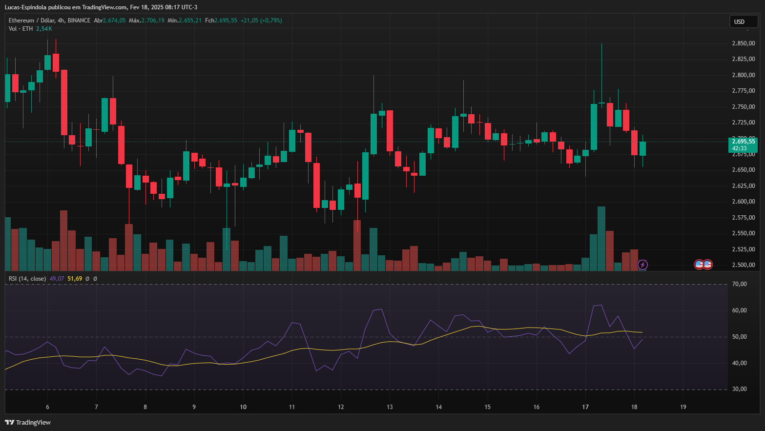 Caso o ETH consiga romper US$ 2.750 com volume crescente, há espaço para uma valorização até US$ 2.870. No entanto, se perder o suporte de US$ 2.650, a criptomoeda pode buscar patamares mais baixos, como US$ 2.600 e US$ 2.550.
