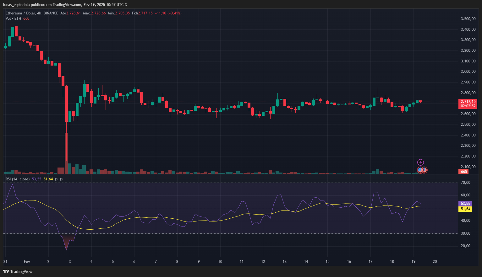 O ETH continua respeitando o suporte em US$ 2.650, enquanto enfrenta dificuldades para ultrapassar a resistência de US$ 2.750. O Índice de Força Relativa (RSI) está em 53,45, demonstrando um equilíbrio entre compradores e vendedores, sem indicar um viés claro de alta ou baixa. O volume de negociação também segue moderado, mostrando que o mercado ainda não tomou uma decisão definitiva sobre a próxima movimentação do preço.