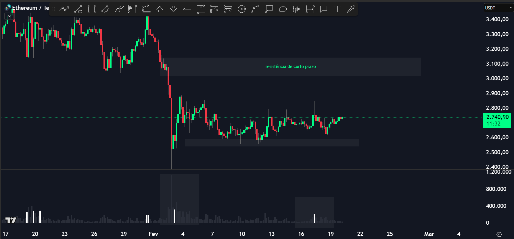 Segundo a analista Ana de Mattos parceira da Ripio, há uma resistência significativa na faixa de US$ 2.780, que tem limitado a recuperação do Ethereum no curto prazo. Para que o ativo consiga superar essa barreira, será necessário um alto volume comprador, indicando que os investidores estão dispostos a sustentar um avanço. Caso esse rompimento ocorra, o ETH pode buscar a região de liquidez dos US$ 3.070, onde se encontra um novo nível crítico de resistência.