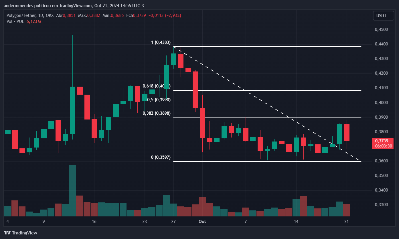 O gráfico diário mostra que a Polygon está em queda desde 27 de setembro, quando formou um topo em US$ 0,43. Desde então, o preço da criptomoeda caiu mais de 17%. Apesar de formar um fundo em US$ 0,35, o token não conseguiu realizar grandes saltos, iniciando a consolidação na qual se encontra.