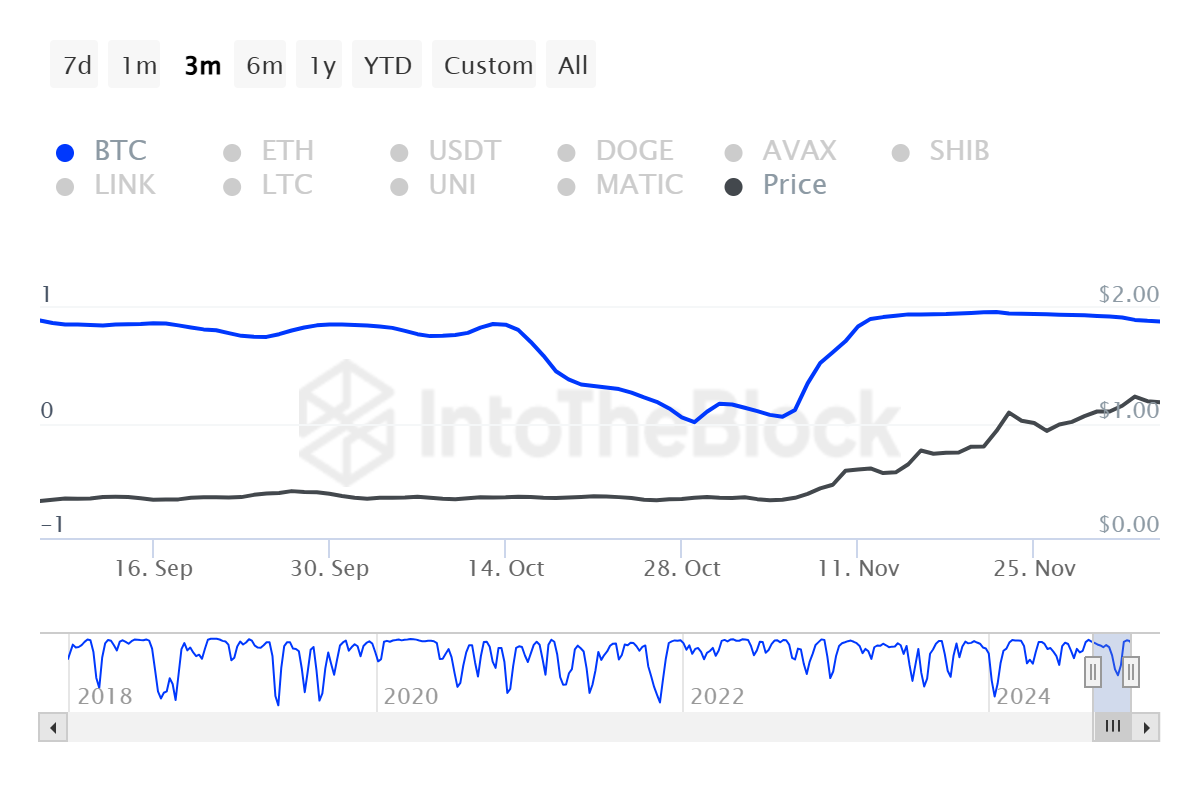 Além disso, se Cardano continuar sua forte correlação com o Bitcoin e o mercado mais amplo de criptomoedas permanecer otimista, há uma forte probabilidade de que ADA continue sua tendência de alta. Um movimento sustentado acima de US$ 1,20 pode desencadear mais atividade de compra, empurrando Cardano para novos patamares, continuando sua alta de 264% ao longo do mês.