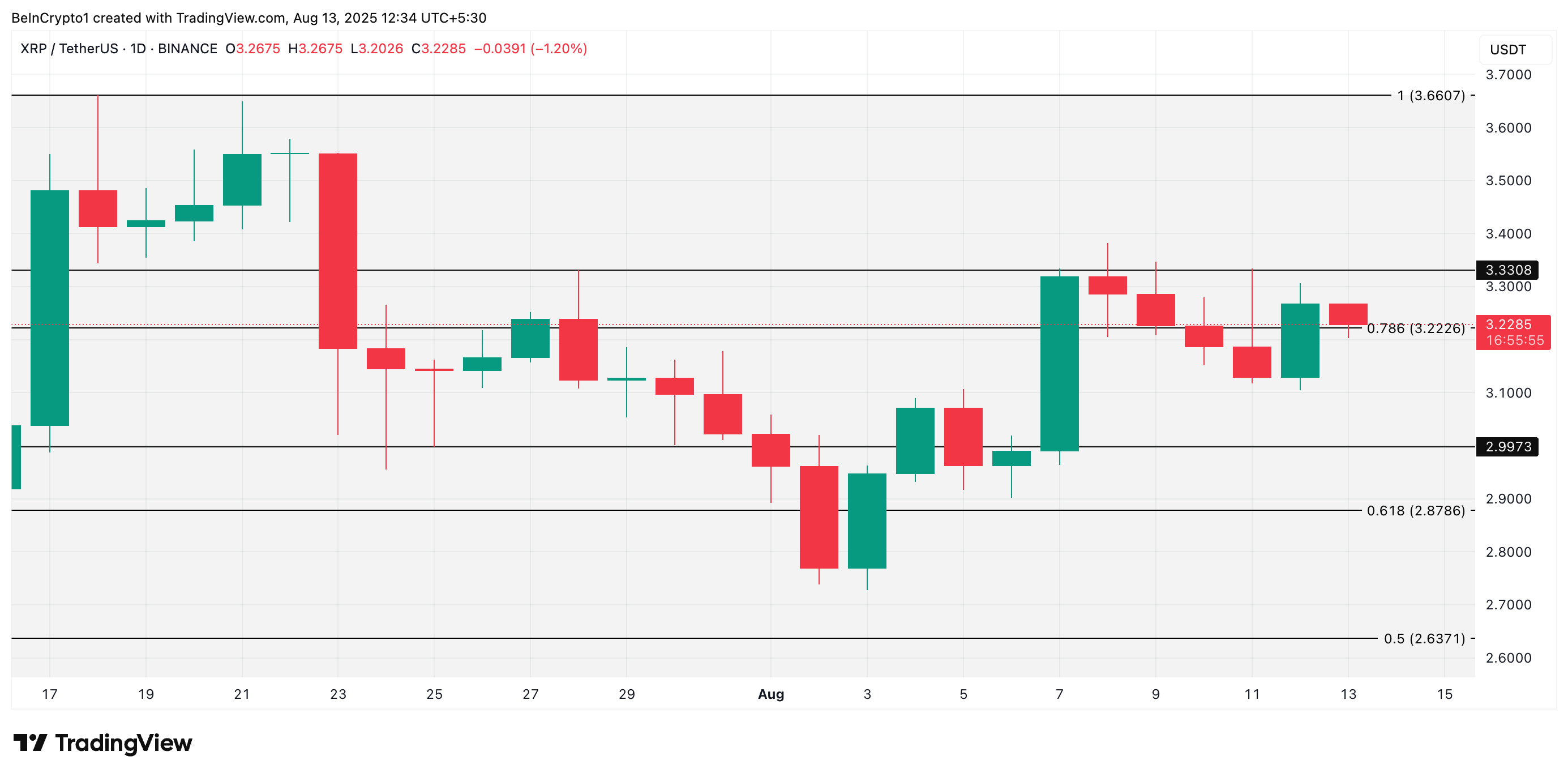 Com alta de 3% no último dia, o XRP é negociado a US$ 3,22 no momento da publicação. Se a demanda se fortalecer, o token pode estender seus ganhos de preço em direção a US$ 3,33. Uma quebra bem-sucedida dessa barreira pode abrir caminho para um movimento próximo a US$ 3,66.