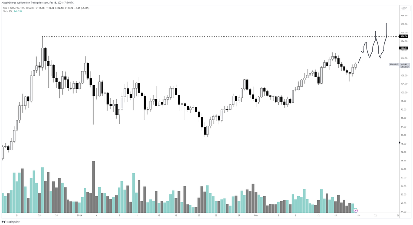 Desde então, o preço da SOL aumentou, criando sucessivos candlesticks semanais de alta. Ela atingiu uma alta de US$ 119 em 14 de fevereiro de 2024.