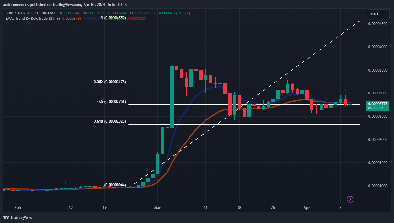 Ao contrário dos dados on-chain, a análise técnica levanta dados mais pessimistas para a tendência futura da Shiba Inu. O gráfico diário mostra que a criptomoeda é negociada no nível de 0,5 de Fibonacci do último movimento de alta de longo prazo, entre os dias 24 de fevereiro e 5 de março.