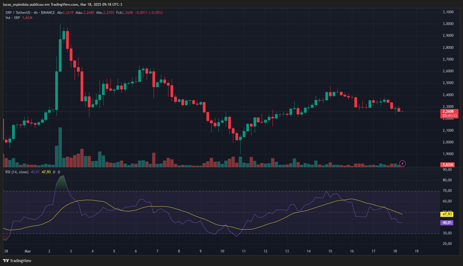 Caso o XRP consiga manter o suporte em US$ 2,25, pode iniciar uma nova tentativa de recuperação rumo a US$ 2,35 e, posteriormente, US$ 2,40. No entanto, se a pressão vendedora persistir e o ativo perder a marca dos US$ 2,25, um novo teste em US$ 2,20 ou até mesmo US$ 2,15 pode ocorrer. O volume de negociação e os indicadores técnicos serão fundamentais para definir o próximo movimento.
