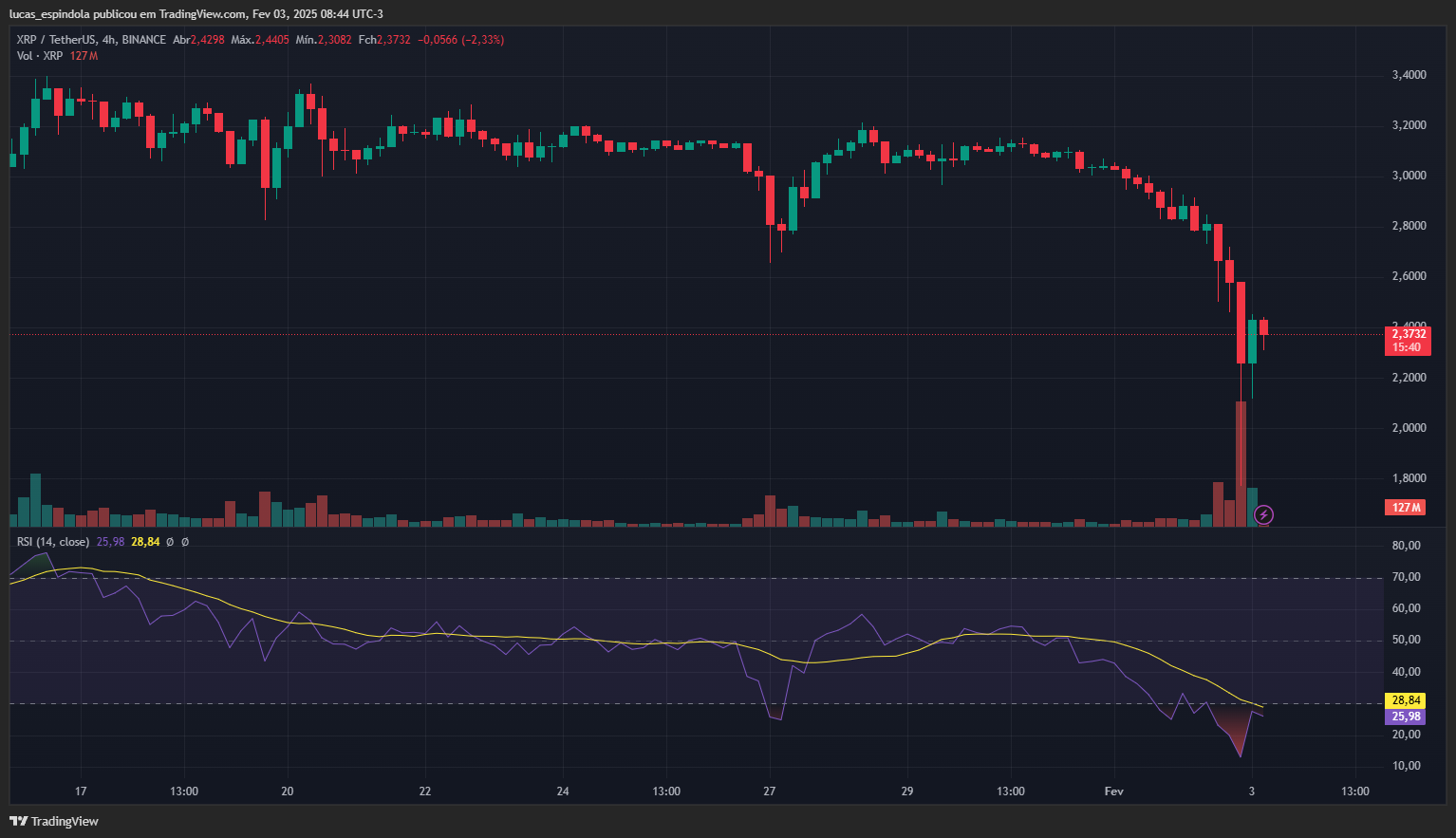 O XRP enfrenta um momento de forte volatilidade, registrando uma queda acentuada seguida por uma leve recuperação. Atualmente, o preço está em US$ 2,35, com uma desvalorização de 2,88% nas últimas horas.