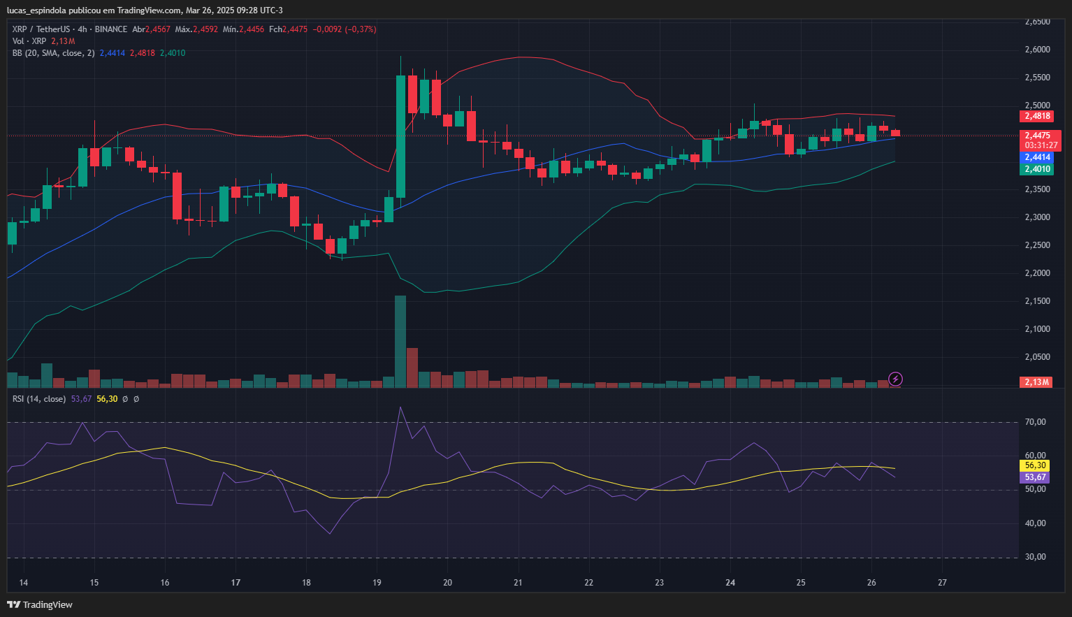 O XRP apresenta leve recuo de 0,42%, sendo negociado a US$ 2,4464 nas últimas quatro horas. O volume negociado atinge cerca de 1,82 milhão de unidades, revelando uma certa cautela entre os participantes do mercado. O cenário atual mostra um comportamento lateralizado, refletido na compressão das Bandas de Bollinger, e um Índice de Força Relativa (RSI) próximo à neutralidade, sugerindo indefinição no curto prazo.