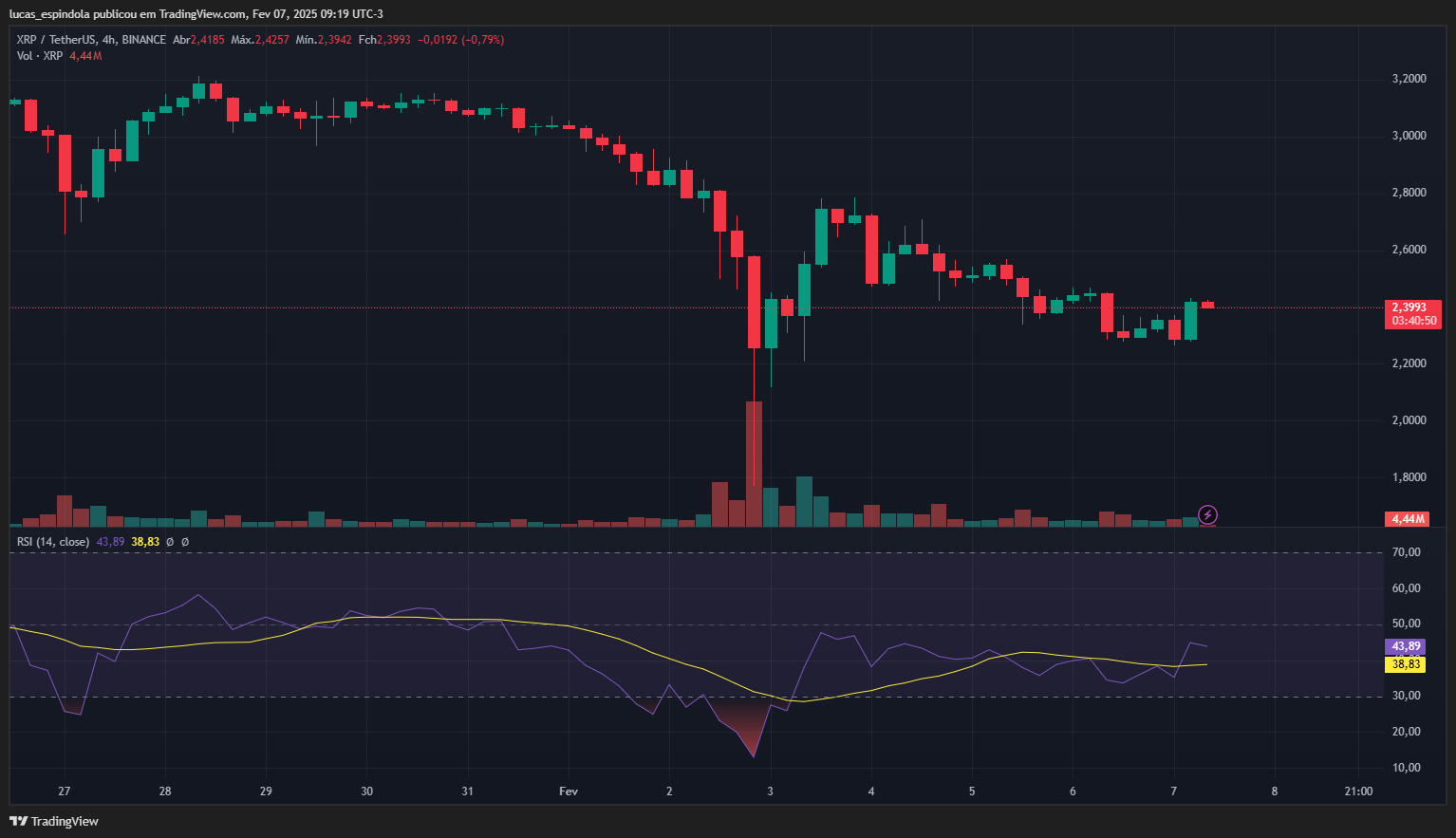 O XRP segue apresentando volatilidade no mercado, registrando oscilações em sua tentativa de recuperação. No momento, o preço está em US$ 2,4017, com uma queda de 0,69%.