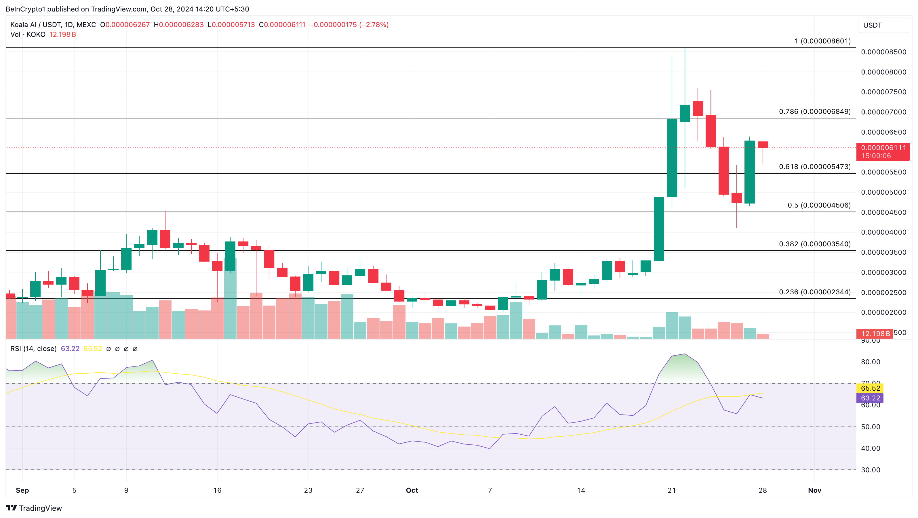 Apesar da tendência de alta, o gráfico diário KOKO/USDT mostra que a altcoin pode perder alguns de seus ganhos. Isso ocorre porque o Índice de Força Relativa (RSI), que mede o momento, caiu.