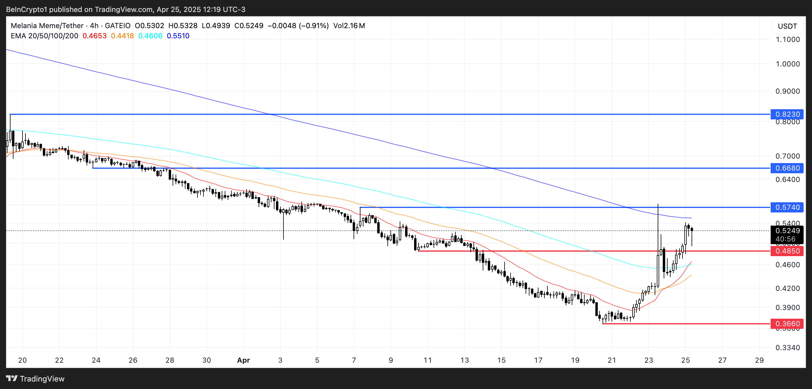 Nos últimos sete dias, a MELANIA subiu mais de 29%, sinalizando um possível retorno do sentimento de alta. Se essa tendência continuar, o token pode testar níveis de resistência em US$ 0,57, seguido por US$ 0,668, e até US$ 0,82.