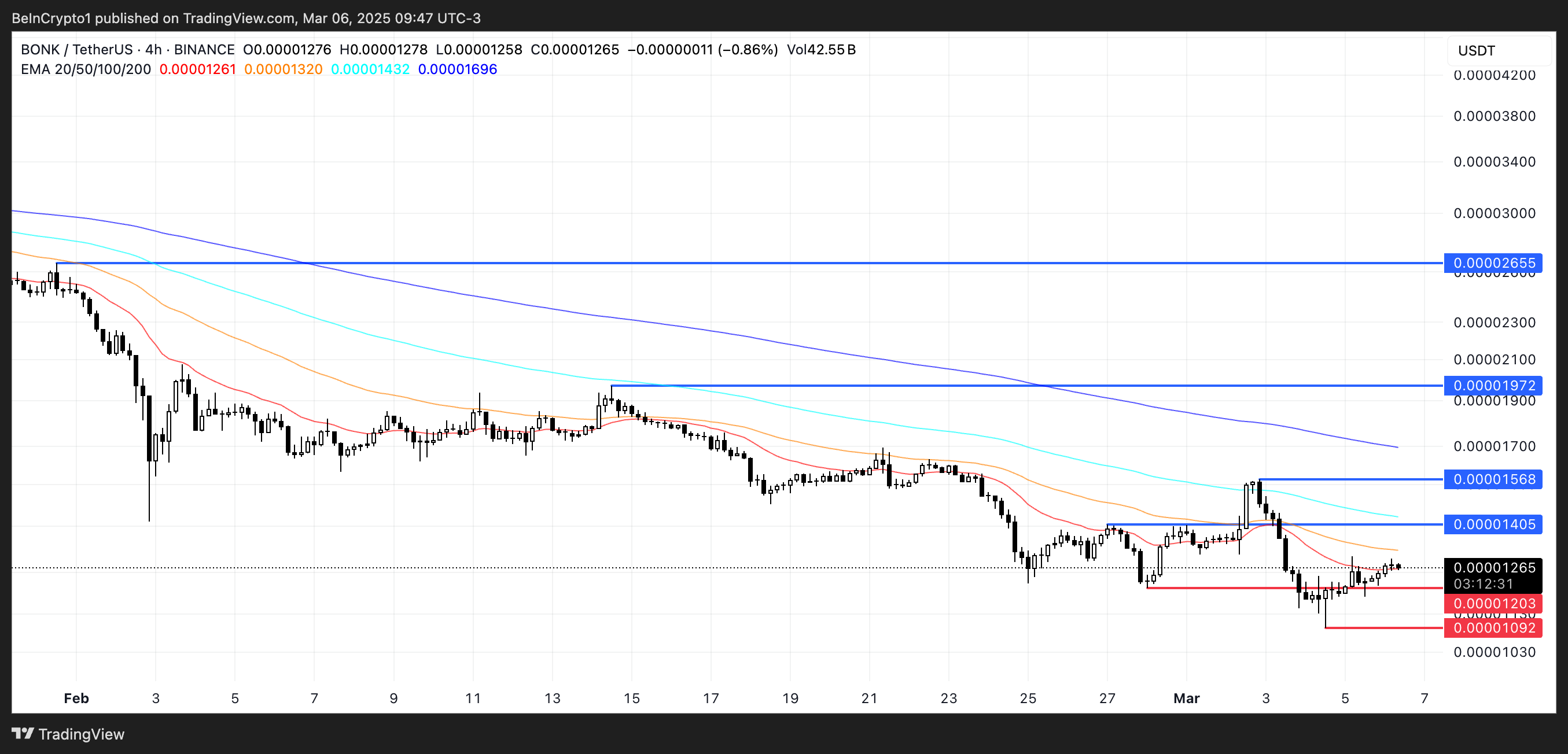 No entanto, se a correção continuar, a BONK pode cair abaixo de US$ 0,000012, testar US$ 0,0000109 e possivelmente cair abaixo de US$ 0,00001 pela primeira vez desde dezembro de 2023.