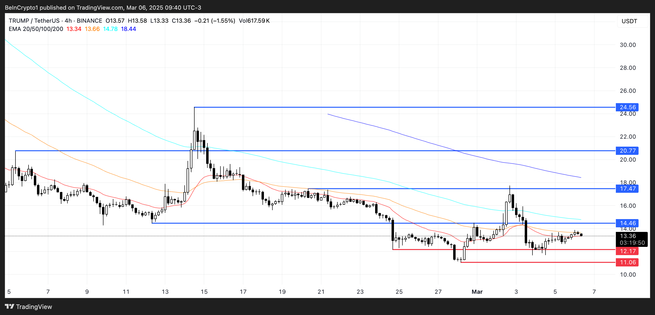 O próximo White House Crypto Summit, que acontece hoje (7), pode impactar significativamente a TRUMP, uma memecoin que tem lutado para se manter abaixo de US$ 20 por mais de duas semanas. O evento pode reacender o interesse na moeda, que está em tendência de baixa há várias semanas.