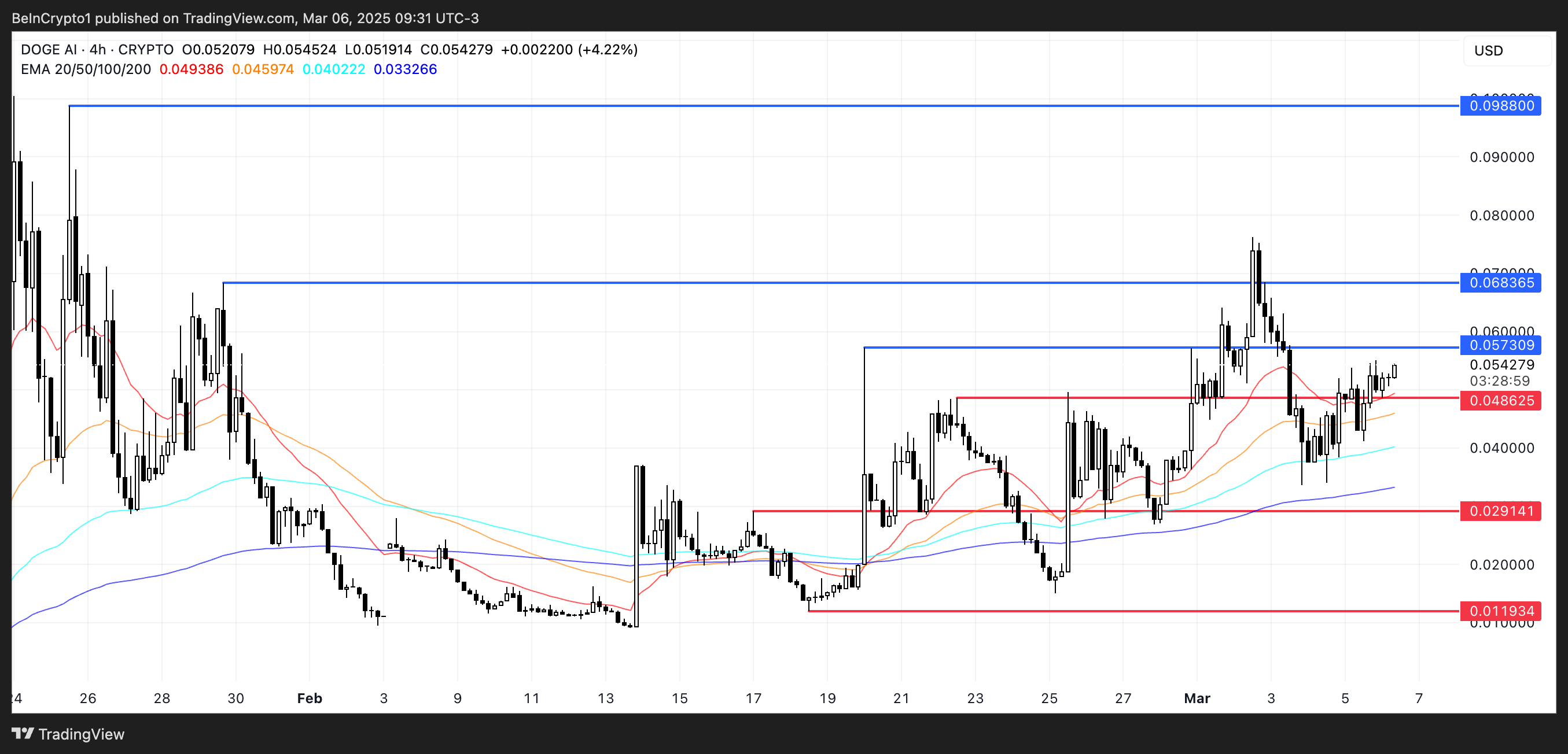 Se a tendência de alta continuar, a DOGEai pode desafiar a resistência em US$ 0,0573, com alvos de alta em US$ 0,0683 e potencialmente US$ 0,098 em um movimento fortemente otimista.
