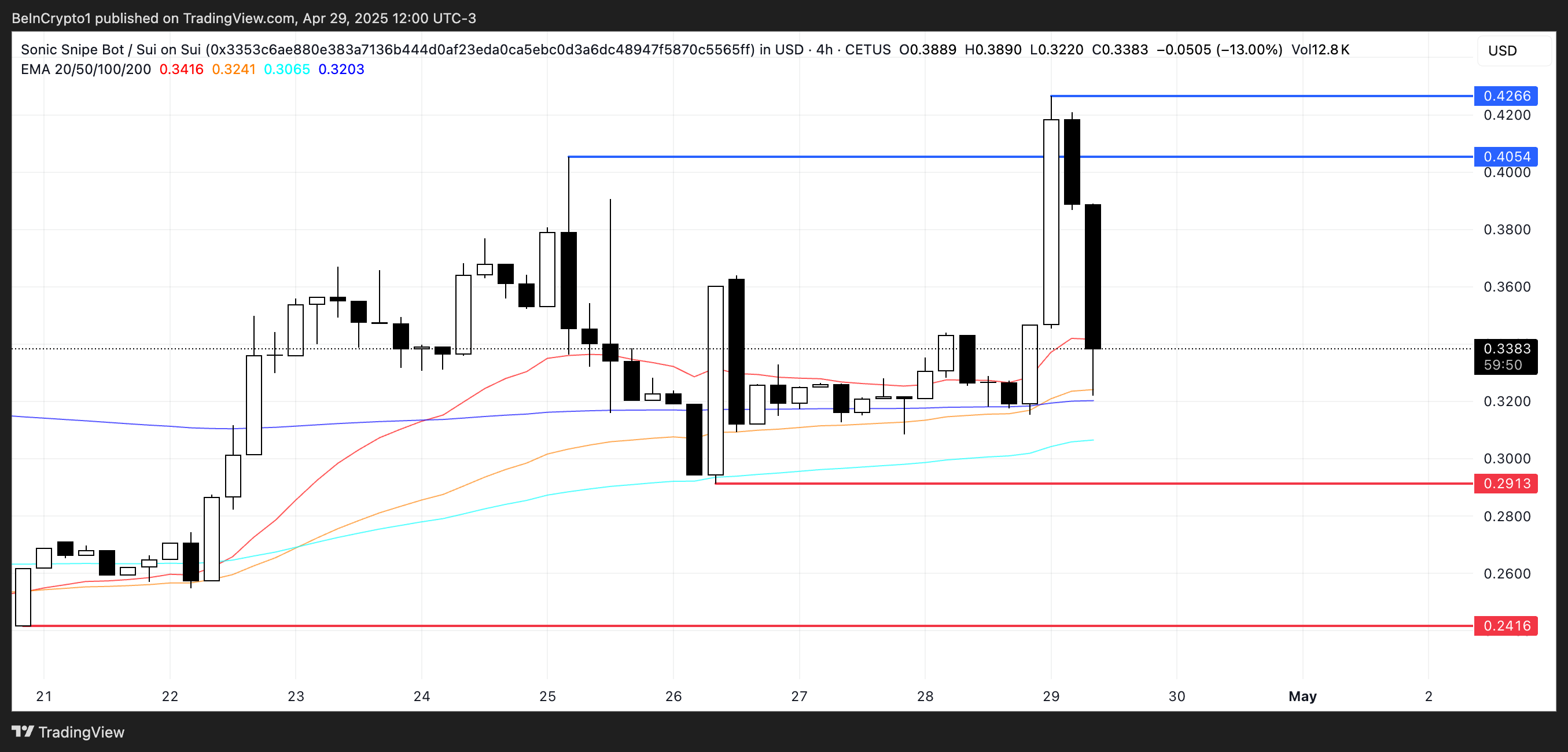 Nos últimos sete dias, a SONIC, o token nativo vinculado ao bot, subiu 27%, elevando seu valor de mercado para aproximadamente US$ 1,7 milhão. Se o impulso positivo continuar, a moeda pode ultrapassar a marca de US$ 0,40 e desafiar o nível de US$ 0,426.