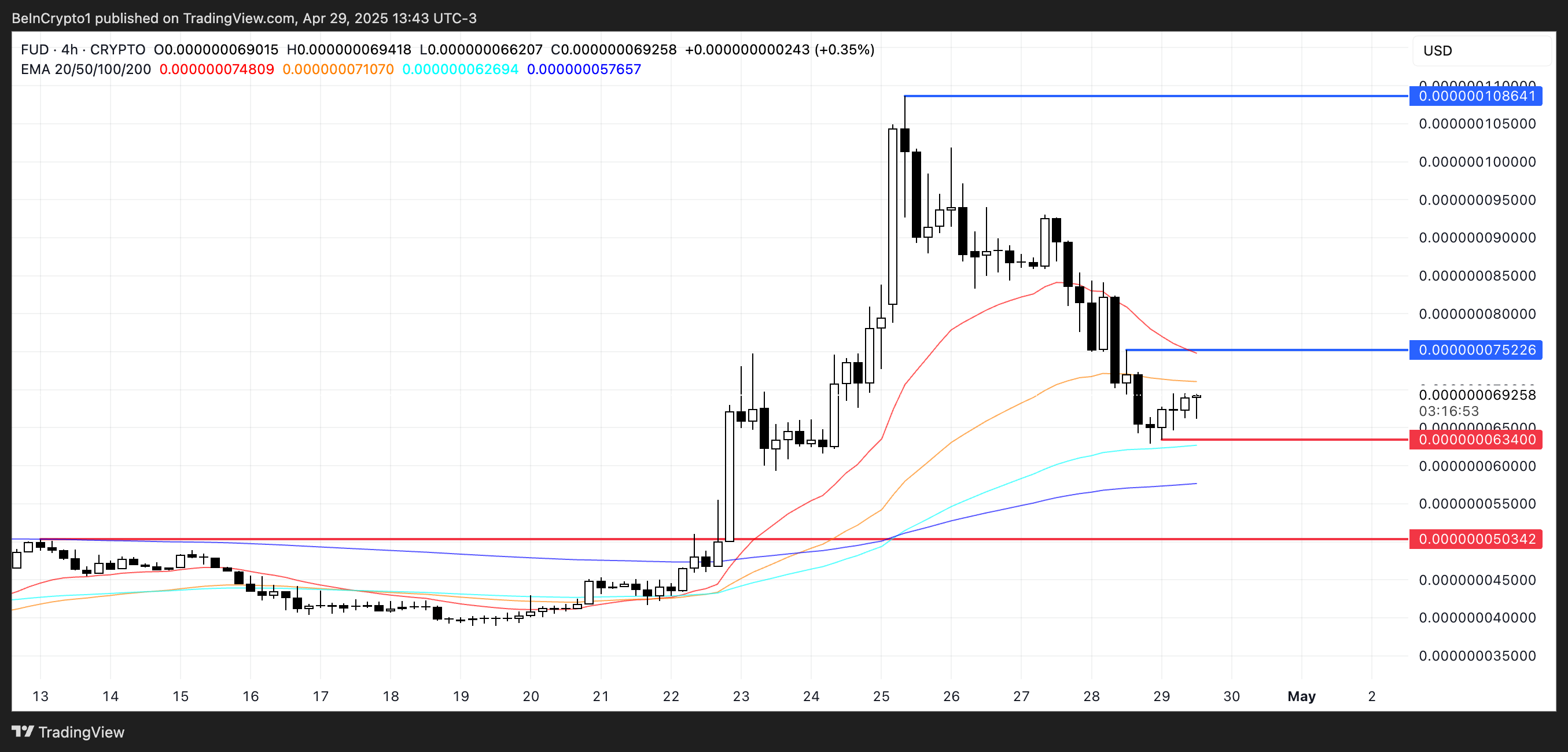 A FUD recentemente testou o nível de suporte em US$ 0,0000000634. Caso esse suporte seja novamente testado e não se sustente, o próximo alvo de queda poderá ser em torno de US$ 0,000000050.