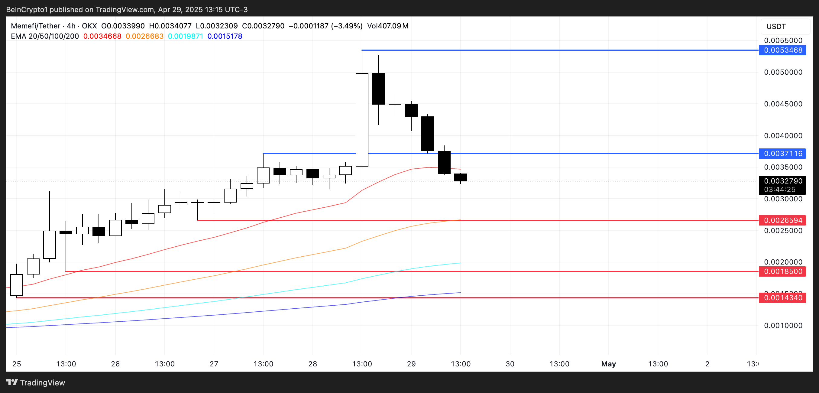 Se ela conseguir recuperar seu impulso de alta, pode primeiro tentar romper a resistência em US$ 0,0037. Um rompimento bem-sucedido abriria o caminho em direção a US$ 0,0053, podendo até estender seu rali.