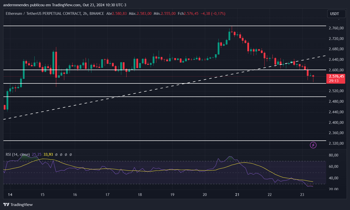 O Ethereum (ETH) segue em tendência de queda, perdendo 2% de seu valor nesta quarta-feira (23). No processo, o suporte de US$ 2,6 mil foi perdido.