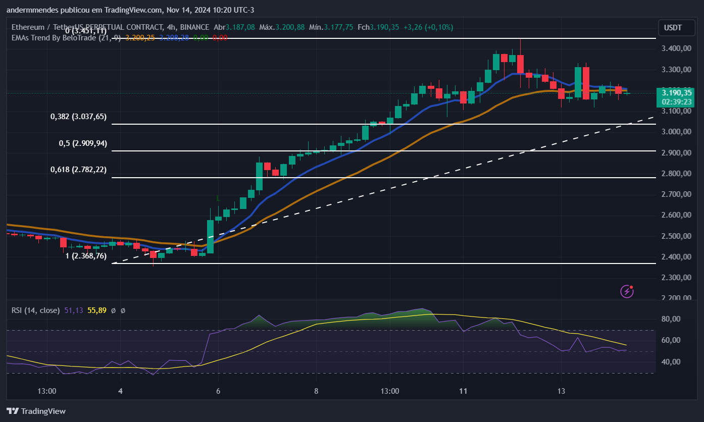 Apesar de operar em alta nesta quinta-feira (14), com uma valorização diária de 0,8%, o ETH está cada vez mais longe do seu topo macro de US$ 3.450.