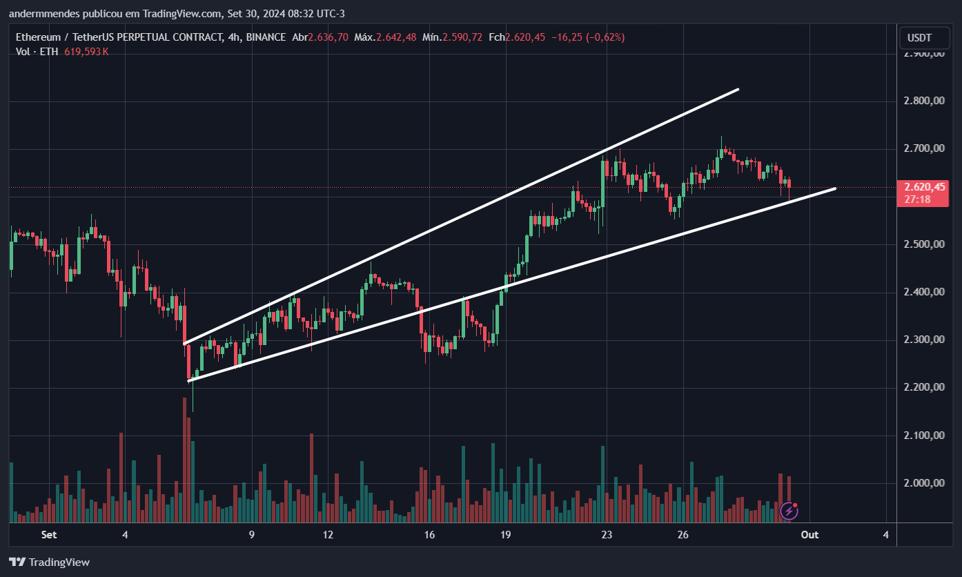 Com isso, o cenário mais provável é uma queda em direção aos fundos mais próximos, em US$ 2.550 e US$ 2.450. Por outro lado, voltar a subir acima das EMAs mencionadas acima indicaria que a linha de suporte do canal segue validada, com o preço podendo seguir em alta dentro do padrão.