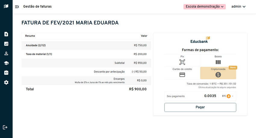 Com a novidade, o Educbank agora permite que as escolas diversifiquem seus meios de pagamento, dando liberdade às famílias de quitarem as mensalidades via cripto, Pix, boleto, dinheiro e cartão de crédito.