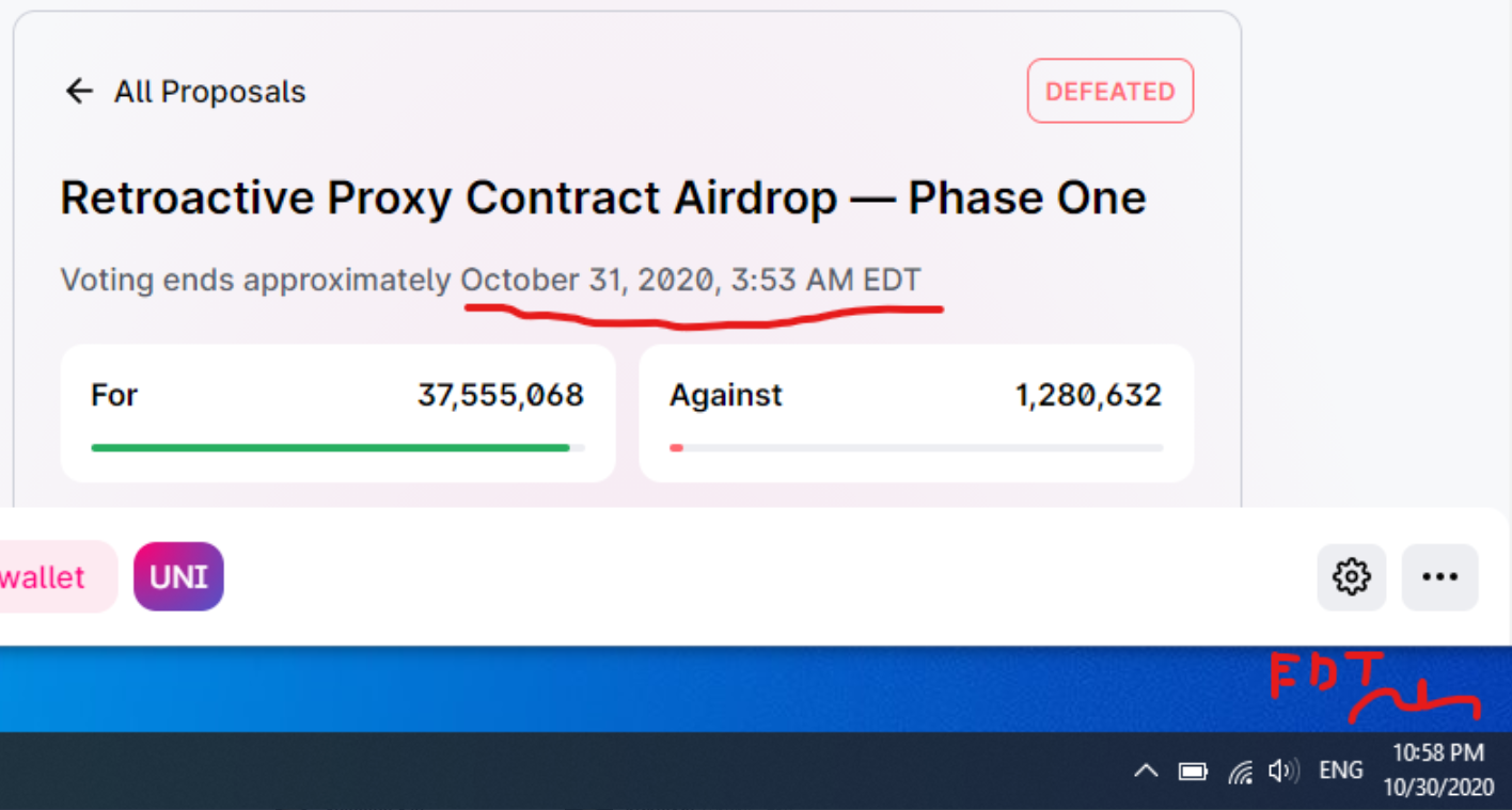 A proposta derrotada teria estendido o enorme airdrop de token UNI de setembro para usuários proxy. A controvérsia também surgiu de que a votação terminou indevidamente cedo.