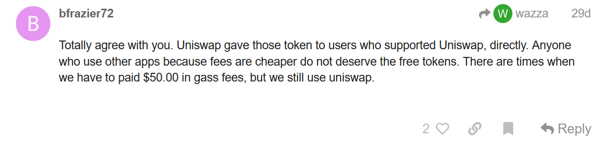 Por outro lado, alguns usuários sentiram que a lealdade ao Uniswap original era o verdadeiro critério para merecer o airdrop.