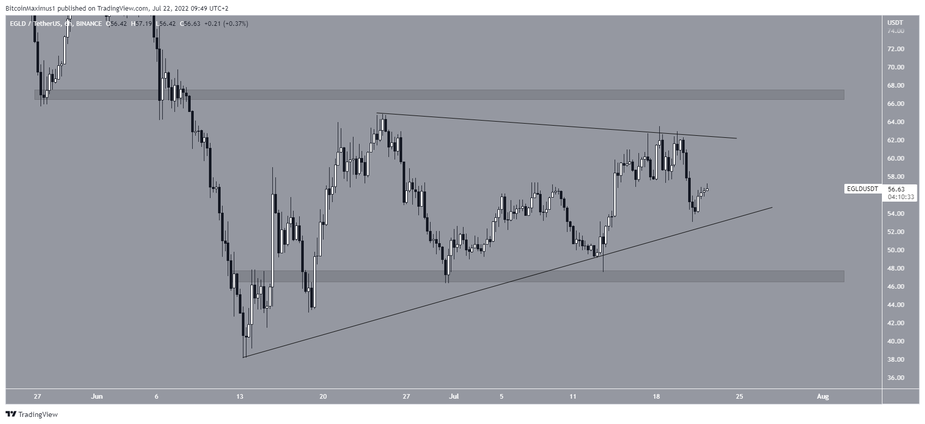 O preço do EGLD está subindo dentro de um triângulo simétrico desde 13 de junho. O token não foi capaz de ultrapassar a resistência desse padrão gráfico na última terça-feira (19) e está de volta perto de sua linha de suporte.