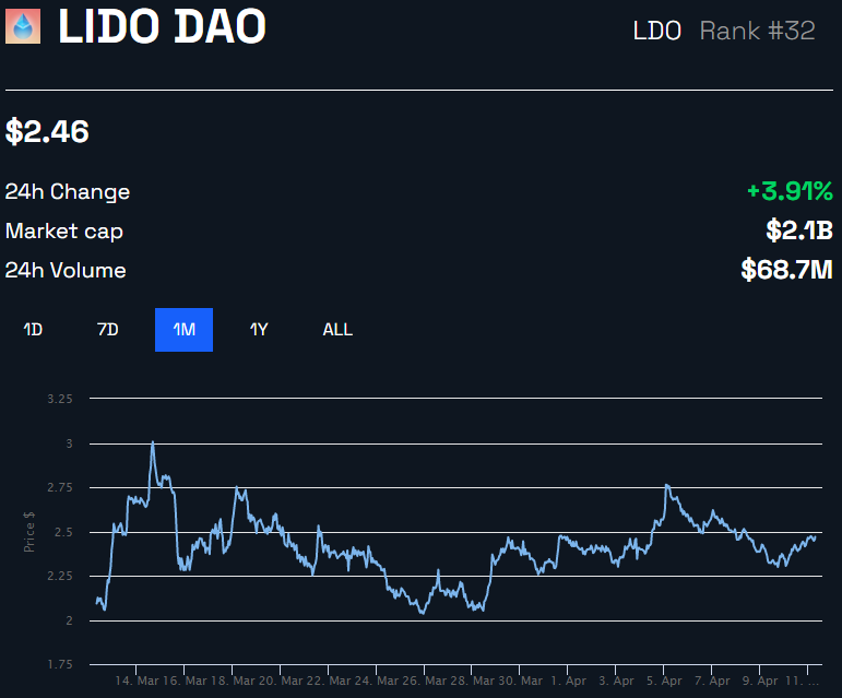Wintermute comprou 2,5 milhões de LDO no valor de US$ 6 milhões em abril. Estes eram “provavelmente para fins de criação de mercado, já que a carteira envia LDO regularmente para vários CEXs”, observou ele.