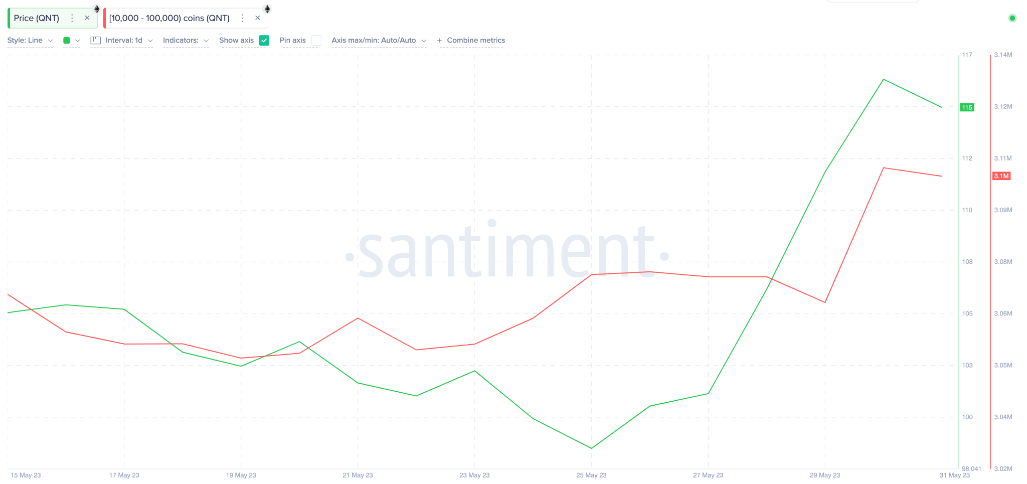 Especificamente, o grupo de baleias com saldos de 10.000 a 100.000 QNT parece estar liderando a recuperação de preços. Como visto abaixo, eles compraram outros 400.000 tokens QNT no valor de aproximadamente US$ 46,4 milhões entre 23 e 31 de maio.