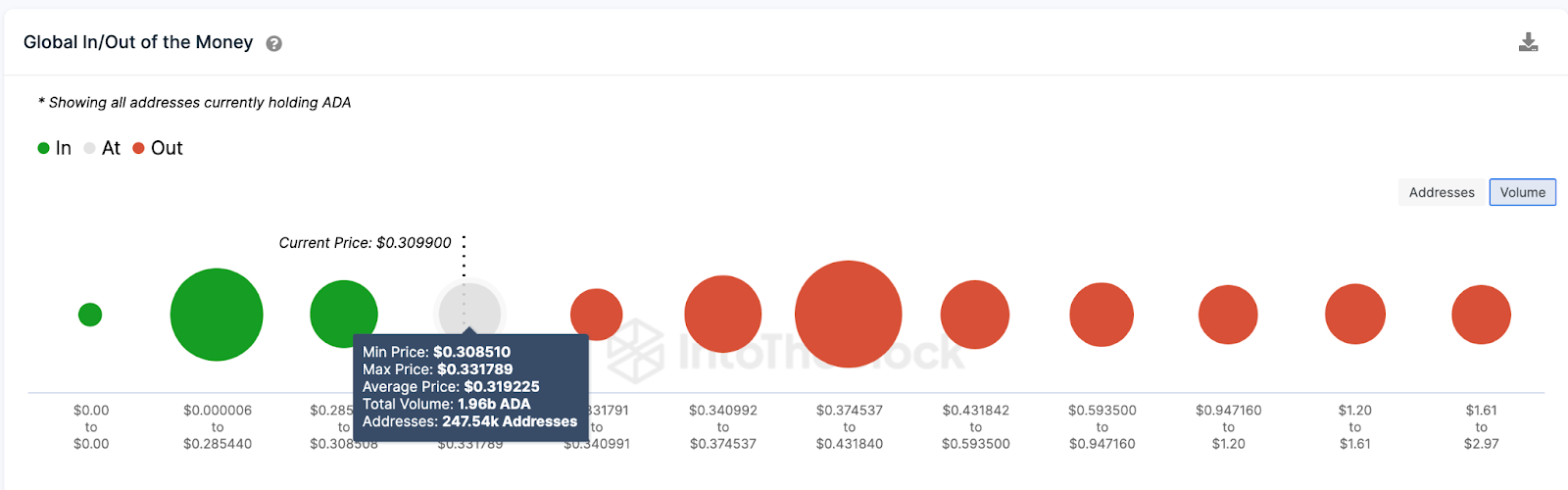 Considerando a queda na atividade das baleias e o frenesi de vendas entre os detentores de longo prazo, a ADA provavelmente cairá abaixo de US$ 0,30 novamente. No entanto, como visto abaixo, 247.540 investidores compraram 1,96 bilhão de moedas ADA ao preço mínimo de US$ 0,30. Se eles puderem montar uma formidável barreira de compra, a ADA poderá continuar sua missão de recuperação.