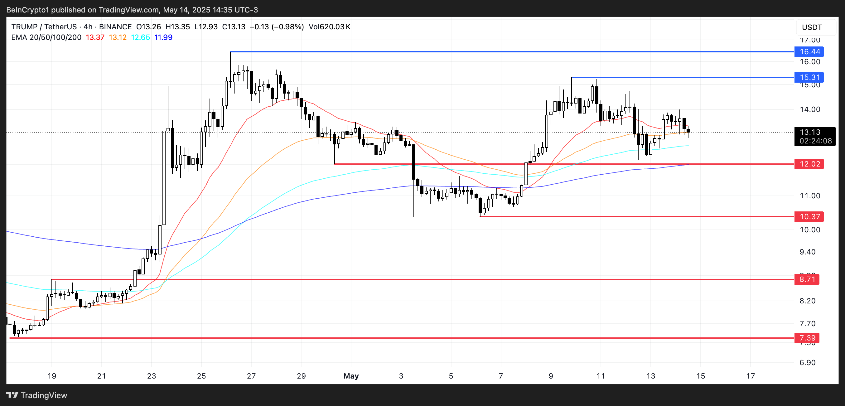 Ainda assim, a tendência de alta não está invalidada. Se os compradores retomarem o controle e o momentum se fortalecer, a memecoin pode subir e testar a resistência em US$ 15,31. Um rompimento claro a partir daí pode abrir caminho para US$ 16,44, continuando a estrutura de alta.