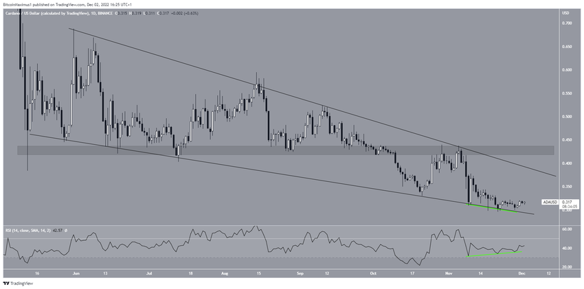 SponsoredEnquanto caía dentro da cunha, o preço da ADA caiu para US$ 0,296 no dia 21 de novembro. Entre os dias 8 e 28 de novembro, o preço da Cardano validou a linha de suporte da cunha três vezes, enquanto o RSI gerou divergência de alta. Este é um sinal de alta que é um bom presságio para o preço futuro.