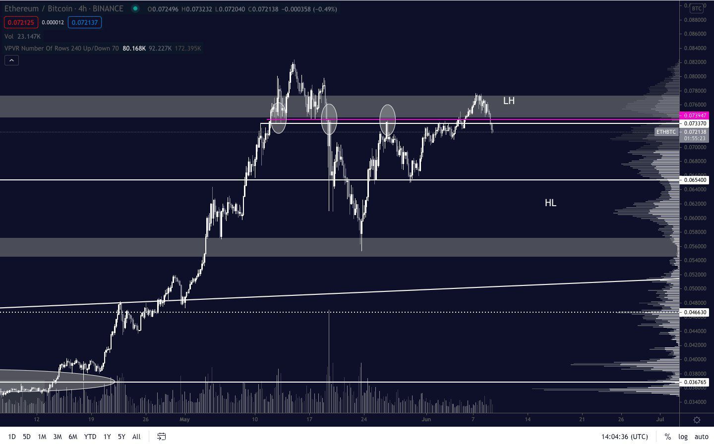 O trader de criptomoedas @Pentosh1 traçou um gráfico para o par ETH/BTC, que mostra o token caindo para 0,0645 BTC.
