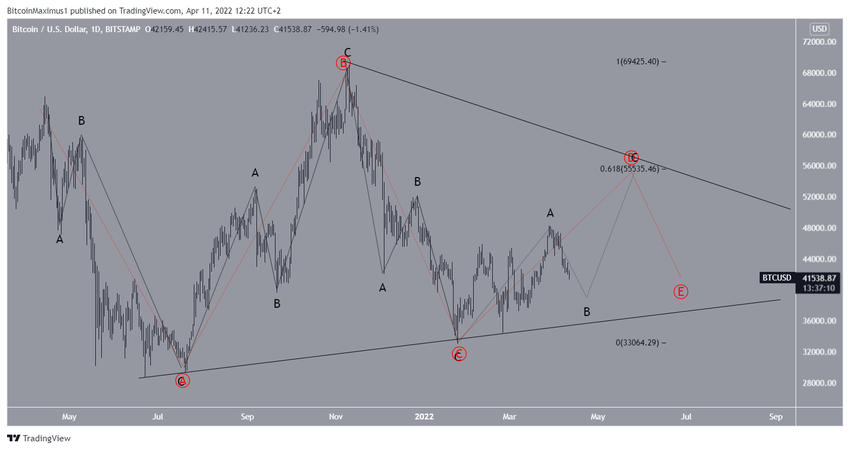 A primeira contagem de ondas em potencial sugere que a onda quatro esteja se formando dentro de um triângulo simétrico. Nele, o BTC está atualmente em sub-onda D (vermelho). Nesta possibilidade, o BTC aumentaria para US $ 51.000 – US $ 55.250. Esta é uma área criada pelos níveis de suporte de retração fib 0,5-0.618. Depois, outra gota seria esperada.