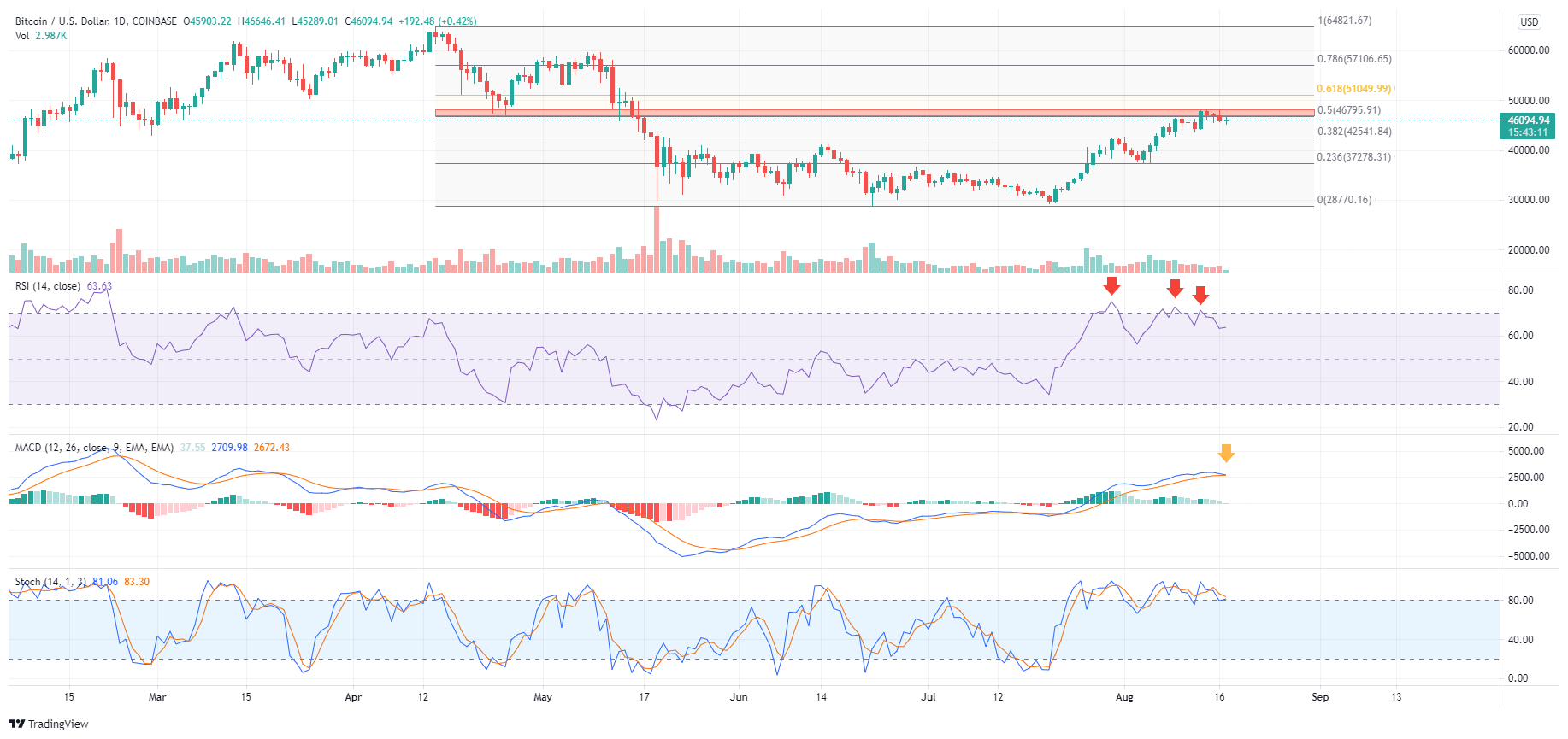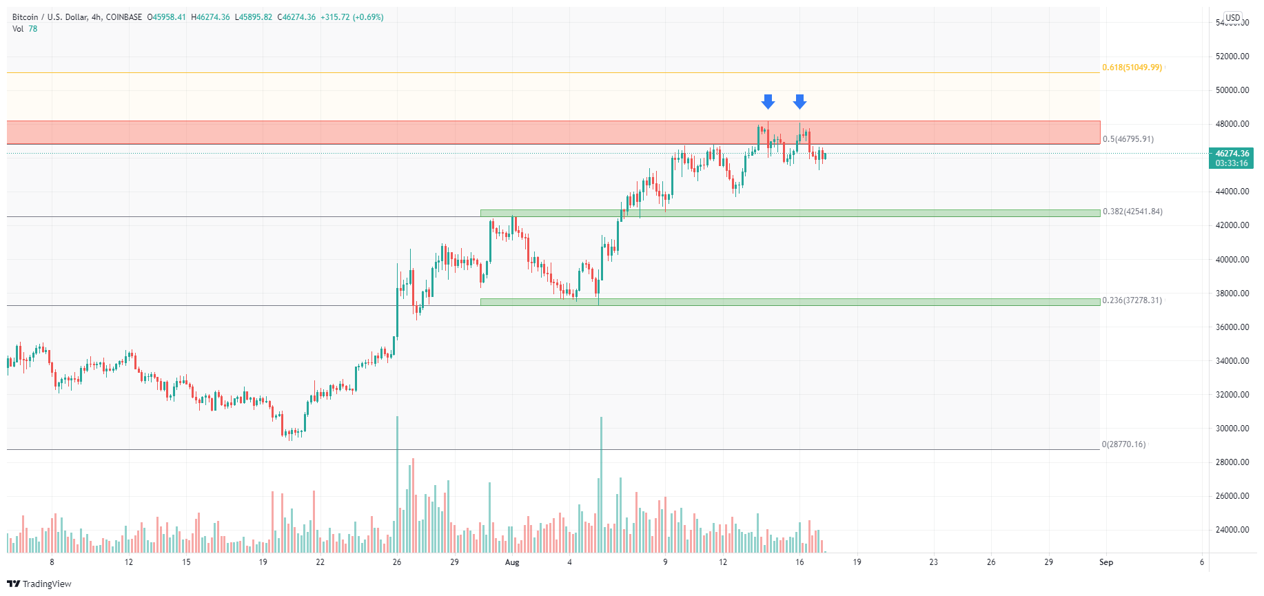 O Bitcoin (BTC) atingiu um topo local de US$ 48.200 entre os dias 14 e 16 de agosto, mas não conseguiu ultrapassar a área de resistência de longo prazo. Se o padrão de topo duplo se formar, a criptomoeda poderá sofrer uma correção de curto prazo antes de retomar seu movimento de alta.