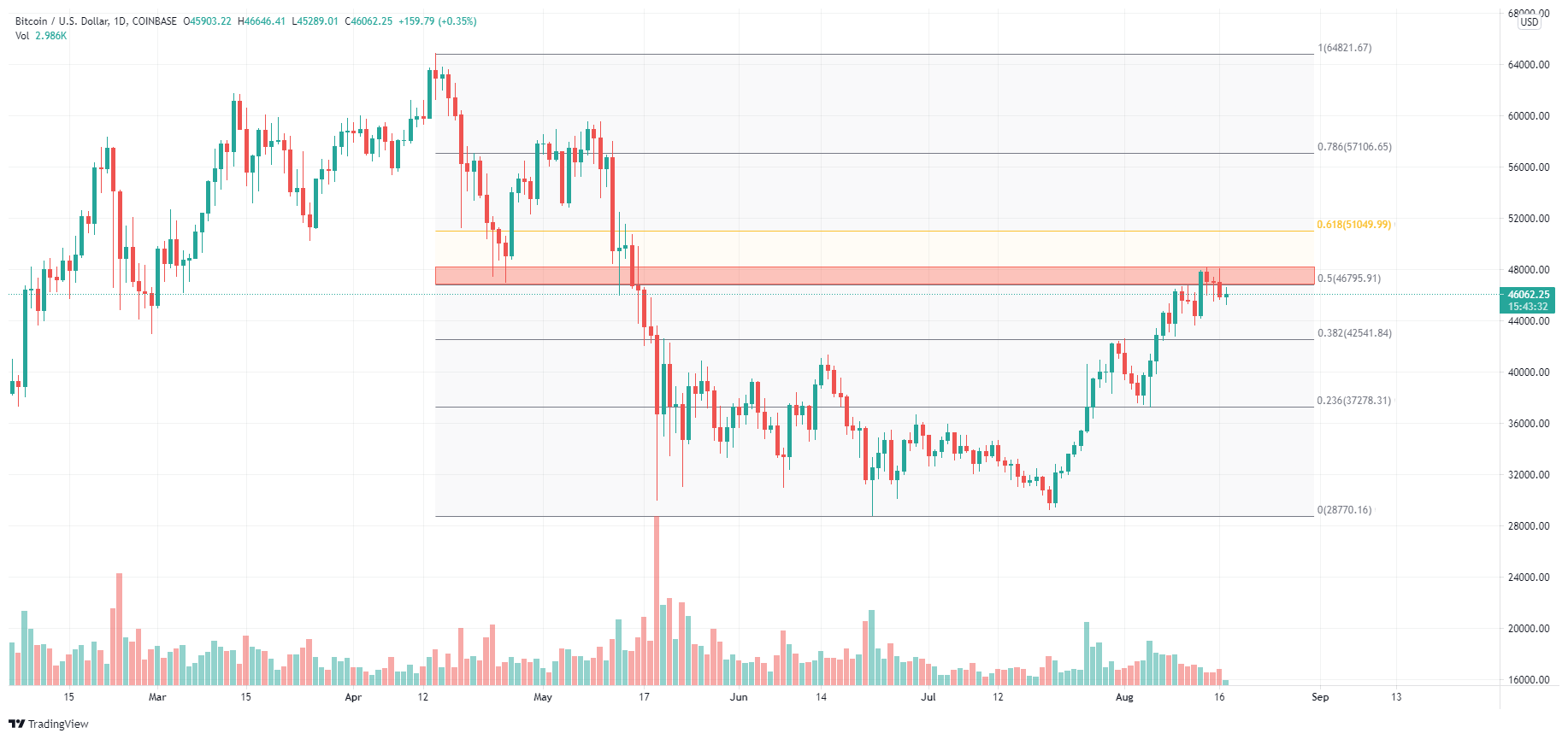 Bitcoin tem subido desde o fundo estabelecido em US$ 29.300 no dia 20 de julho. O ativo conseguiu fazer topo mais alto em US$ 42.600, seguido por uma baixa em US$ 37.300. No último fim de semana, o BTC conseguiu realizar outro topo em US$ 48.200.