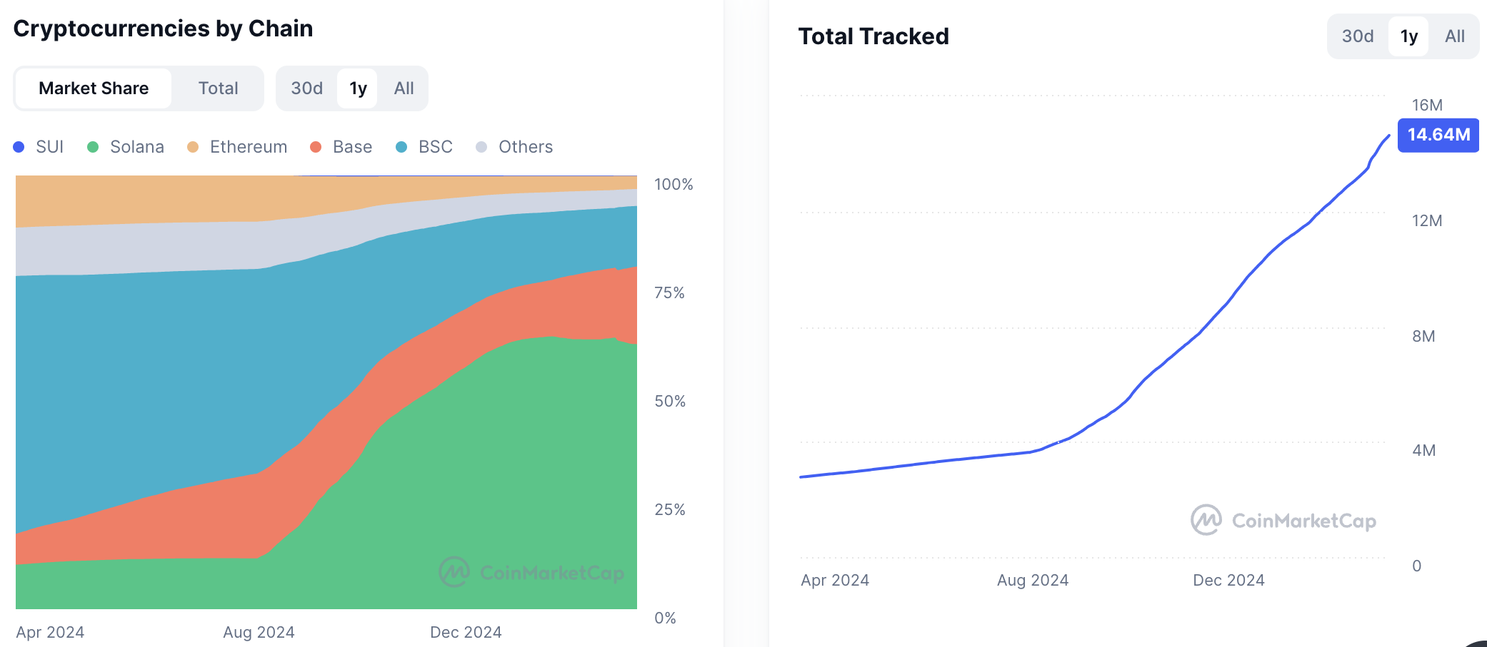 Há um ano, o número de tokens rastreados era de apenas 2,7 milhões. Desde então, o principal motor desse crescimento tem sido o boom das memecoins na rede Solana, que hoje responde por mais de 60% de todos os tokens existentes.