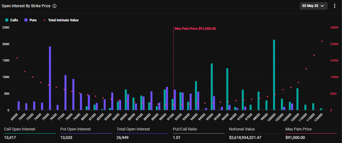 Segundo a Deribit, 26.949 contratos de opções de Bitcoin expiraram hoje (2). O ponto de dor máxima — nível de preço que resulta no maior prejuízo agregado aos investidores — foi estabelecido em US$ 91 mil, valor no qual a maioria dos contratos perde validade sem gerar retorno.