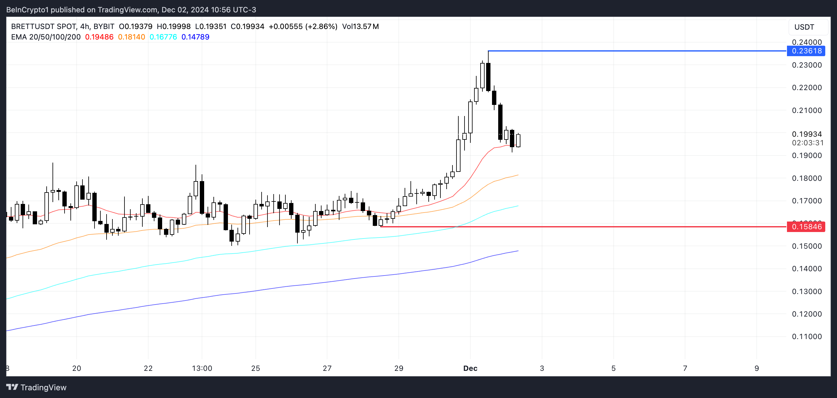 Os indicadores técnicos da BRETT sugerem um cenário potencialmente de baixa. Se o preço cair abaixo de sua linha mais curta de Média Móvel Exponencial (EMA) enquanto as linhas de EMA de curto prazo permanecem acima das de longo prazo, isso pode sinalizar um impulso descendente adicional.