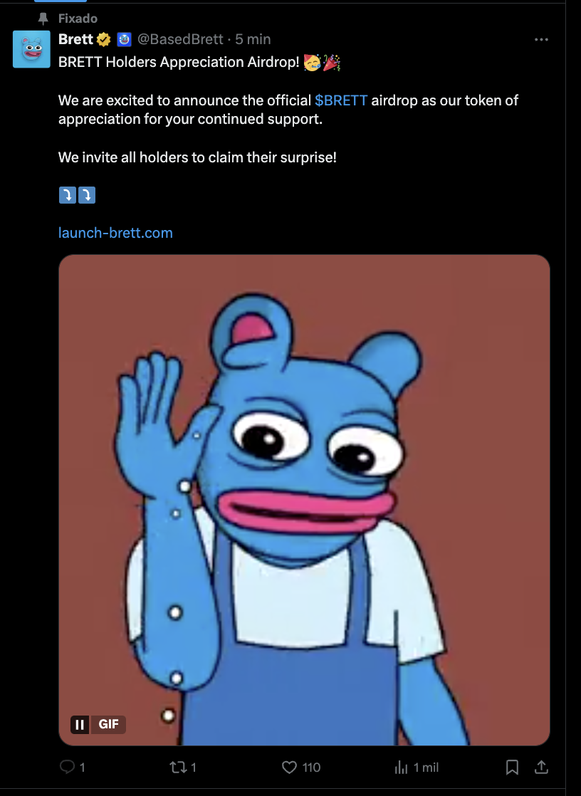 Nesta segunda-feira (2), o perfil do X da BRETT começou a postar um link suspeito para um suposto airdrop. O perfil continuou postando mais vezes e até fixou um tweet no perfil. Quando o mercado tomou conhecimento do possível hack, o preço da altcoin começou a cair.