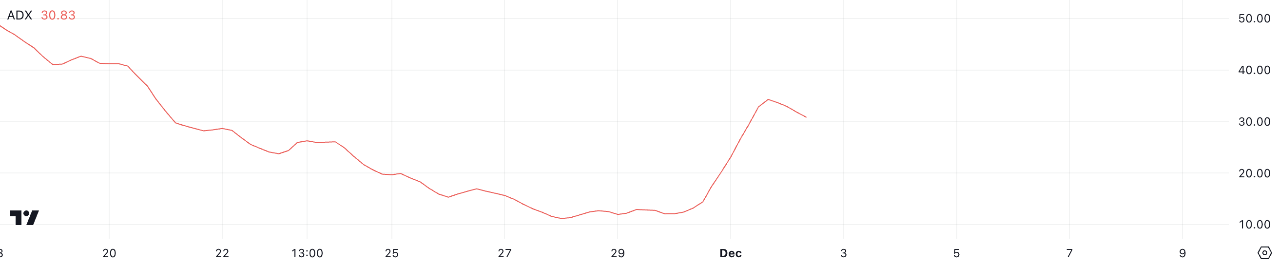 Esse índice varia de 0 a 100, com interpretações chave em diferentes limiares. Uma leitura acima de 25 sugere uma tendência forte, enquanto valores entre 25-50 indicam uma tendência robusta. Atualmente a BRETT está em 30,8, embora ainda indique uma tendência forte, enfraqueceu ligeiramente de 34.