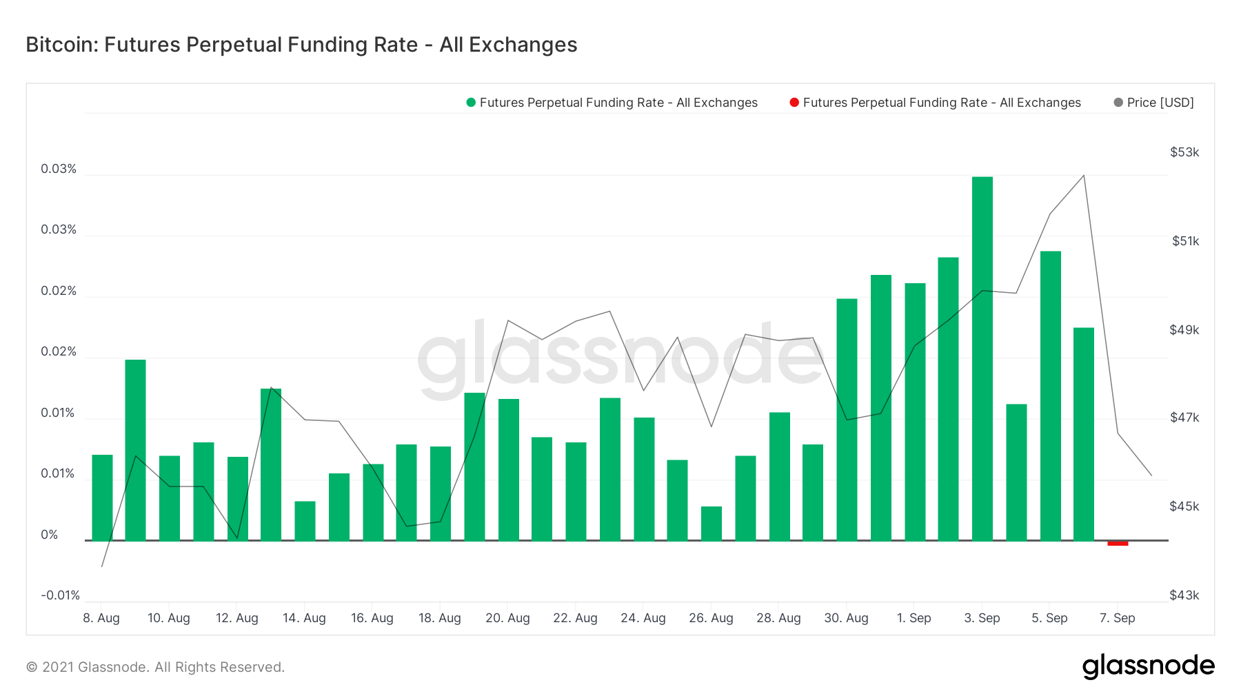 Outro indicador que confirma a liquidação das posições compradas alavancadas e a mudança no comportamento dos traders é a taxa de financiamento de futuros perpétuos. Quando a taxa é positiva, as posições de compra pagam periodicamente taxas para as posições de venda. Por outro lado, quando a taxa é negativa, as posições de venda pagam periodicamente para as posições de compra.
