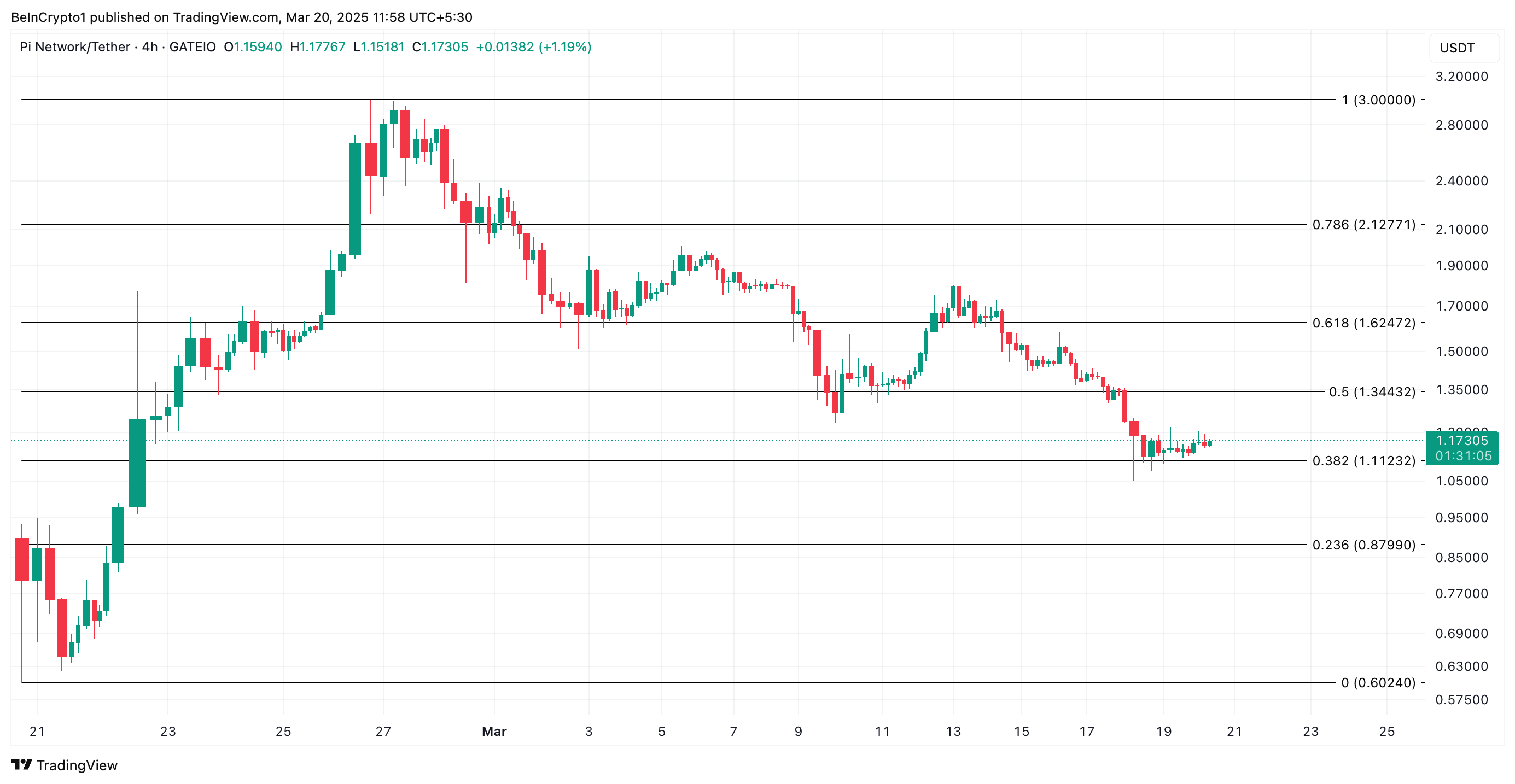 Atualmente, a PI é negociada a US$ 1,17, registrando um aumento de 1% no preço nas últimas 24 horas. Apesar desse modesto avanço, o volume de negociação em declínio sugere que a leve recuperação não é sustentada por uma forte demanda pela altcoin. Ela apenas reflete o crescimento geral do mercado registrado no mesmo período.