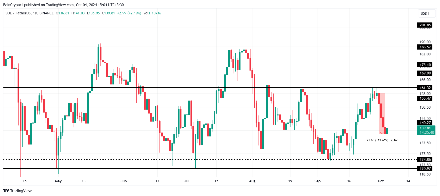 A Solana está atualmente negociada a US$ 139, logo abaixo do nível de suporte local de US$ 140. Considerando o momento baixista contínuo e o sentimento negativo do mercado, uma queda adicional para US$ 124 é mais provável. Esse nível atuou como um suporte para a SOL no mês passado, com a criptomoeda se recuperando dele anteriormente.