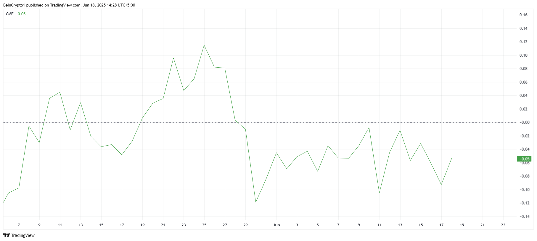 O momento macro geral da Cardano também é afetado por fracos influxos de investidores. O indicador Chaikin Money Flow (CMF), que mede a acumulação e a distribuição de um ativo, está atualmente abaixo da linha zero. Isso indica que há entradas limitadas de capital, impedindo qualquer aumento substancial no preço da ADA.