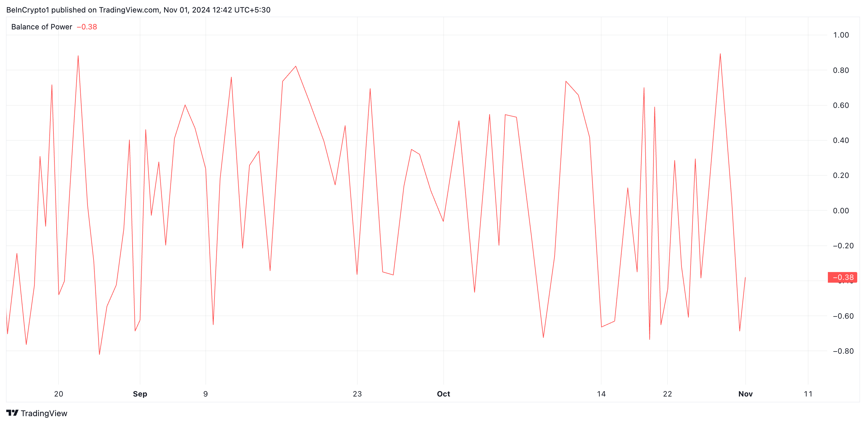 Além disso, a queda acentuada no Balanço de Poder (BoP) da moeda apoia essa perspectiva baixista. A avaliação do BeInCrypto do gráfico diário SUI/USD revela que esse indicador, que mede a força dos compradores versus vendedores no mercado, está em declínio desde 29 de outubro.