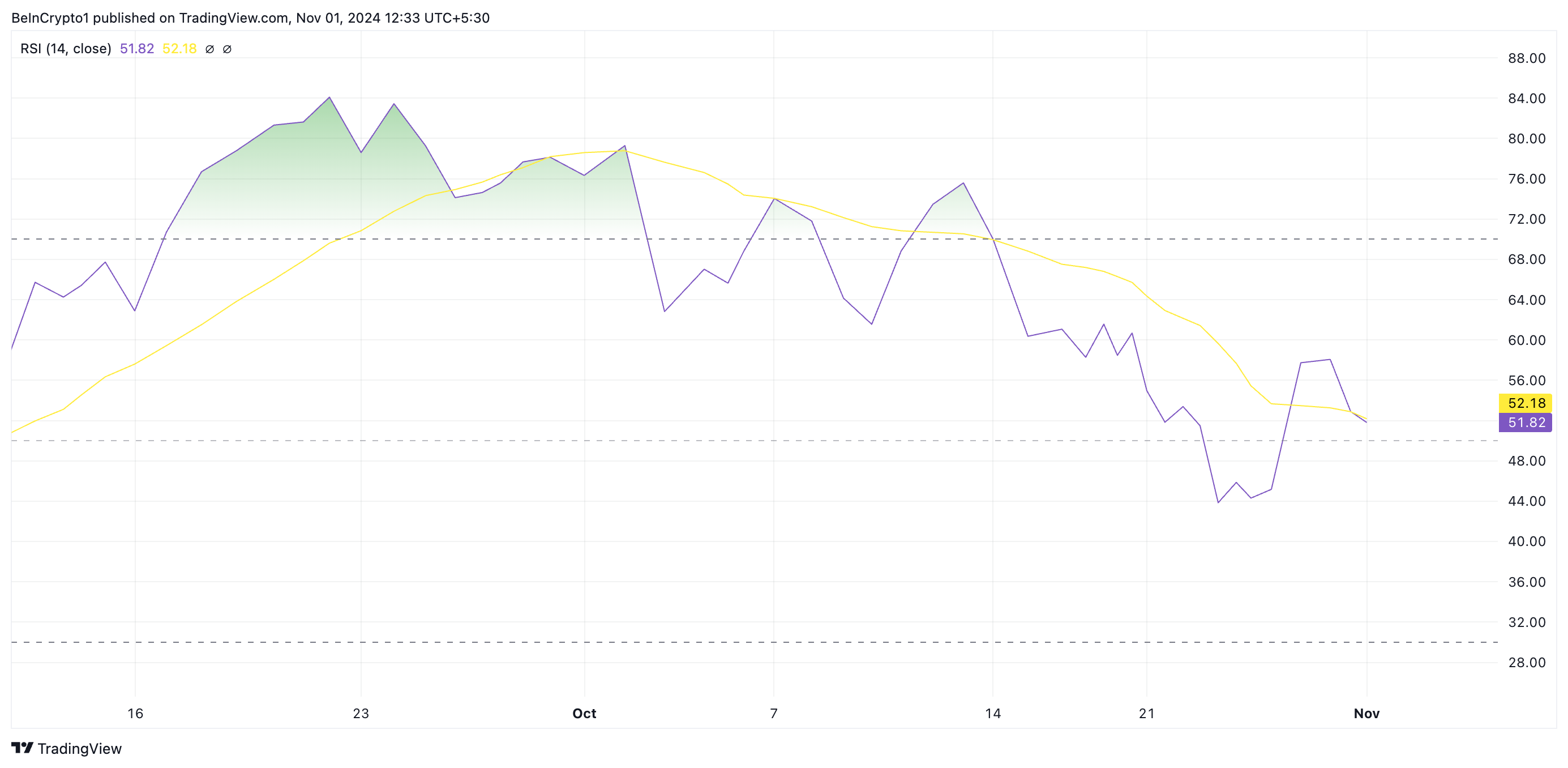 A tendência de queda do Índice de Força Relativa (RSI) da SUI é um indicador visível da queda na demanda pela altcoin. No momento deste texto, ele está em 51,82, prestes a ultrapassar a linha neutra de 50 e estender sua queda.