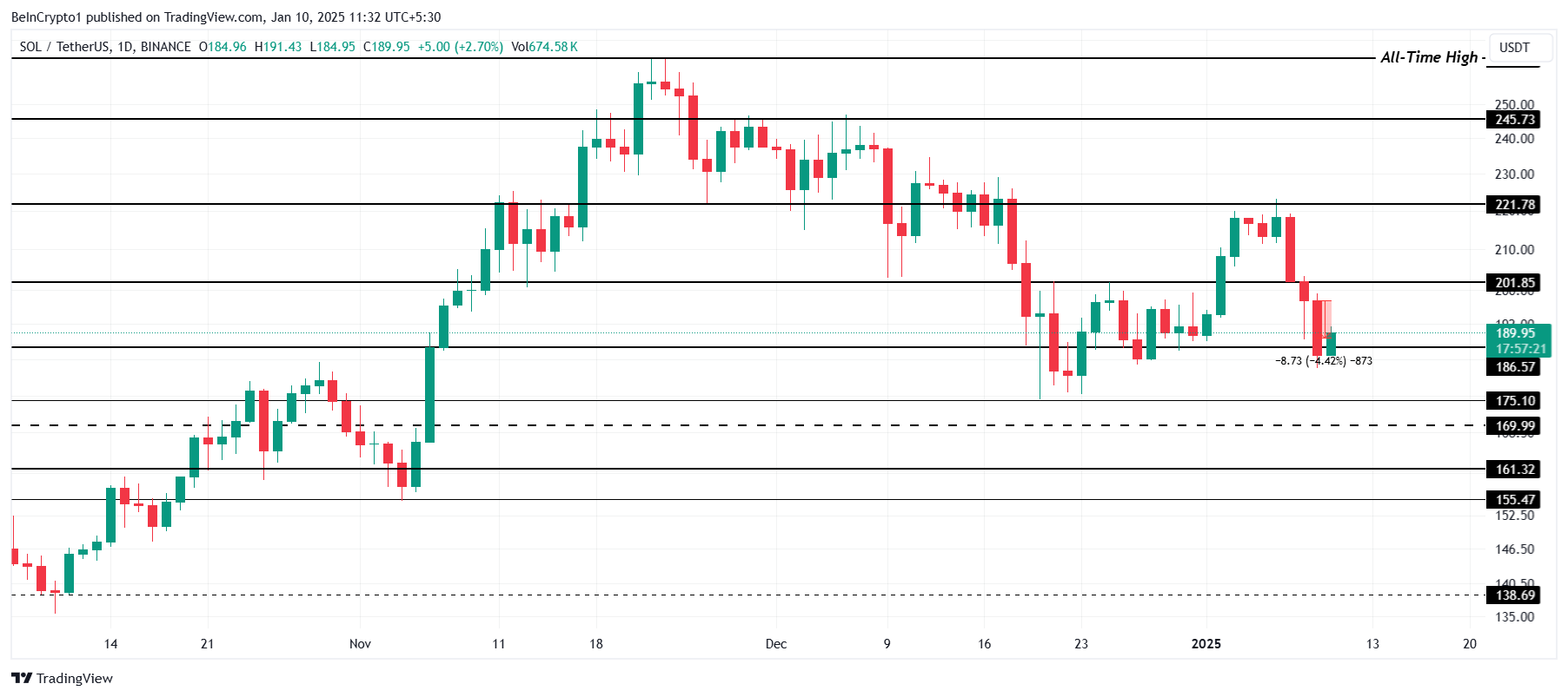 Atualmente, a SOL está em US$ 188 após recuperar o nível crítico de suporte de US$ 186. A altcoin agora está mirando o nível de resistência de US$ 201, visando convertê-lo em suporte para preparar o terreno para uma possível recuperação.