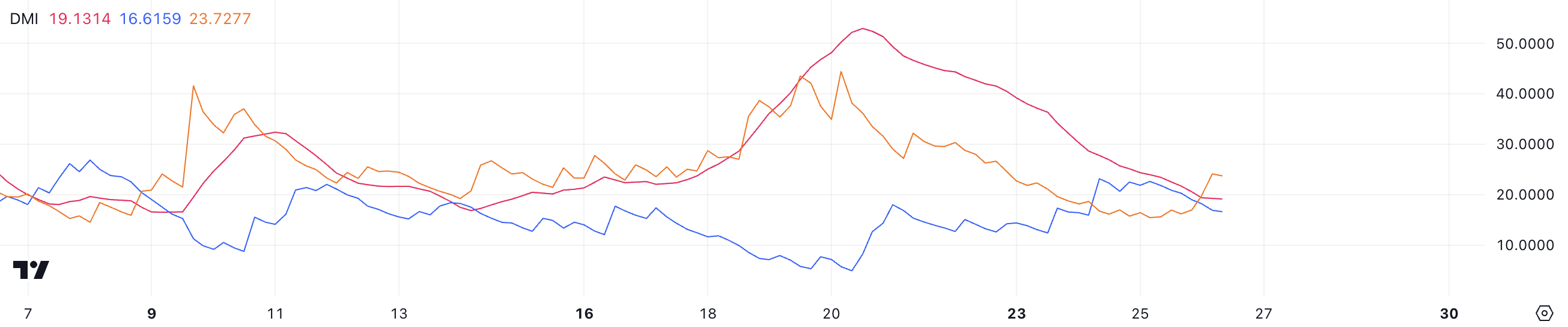 ADX é um indicador de força de tendência que mede a intensidade de uma tendência em uma escala de 0 a 100, sem indicar sua direção. Valores abaixo de 20 sinalizam tendências fracas, enquanto valores acima de 25 representam tendências fortes. Com o ADX em 19,13, a tendência de baixa carece de força significativa, apesar dos vendedores manterem o controle, como indicado pelo D- mais alto.